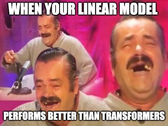This one is quite intriguing. Zeng et al. (2023) showed a simple linear model can outperform transformer-based models such as Autoformer (Wu et al., 2021) and Informer (Zhou et al., 2021) in long-term forecasting on several benchmarks.